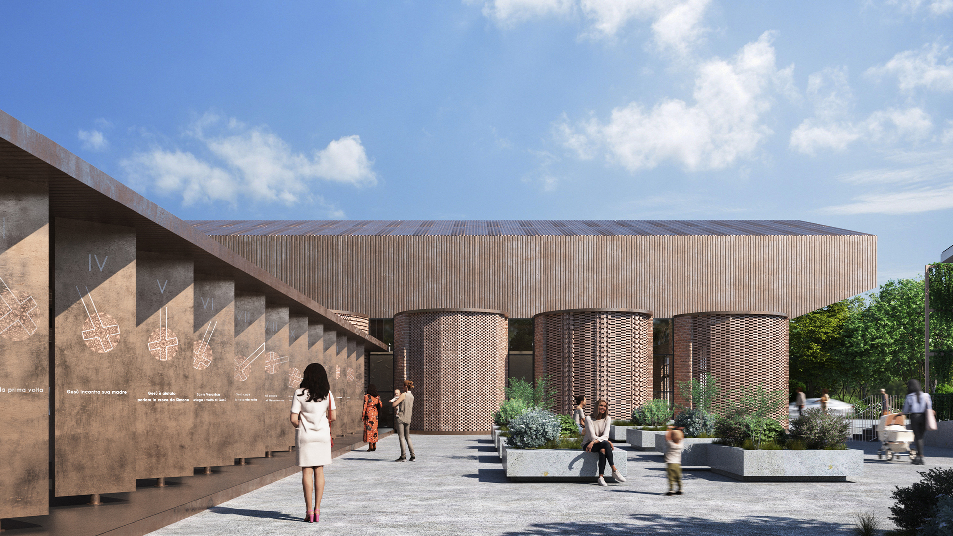For this reason it is necessary to reinterpret the types, shapes and volumes of the traditional architecture of the village to create a new building able to fit seamlessly into the collective imagination dear to residents, creating a new place that is the extension of known places, an environment in which the community can rediscover itself as such, a large family that gathers under one roof without separations: young people who repopulate the village build their role as citizens in places where they can meet in safety and freedom with the elderly, keepers of memory, knowledge and local tradition. Although it fits within the urban layout without fractures, the recognizability of the new Church is guaranteed by the presence of clear signs such as the large cross carved in the apse wall, the organic volumes of the side chapels and from the high bell tower that stands as a sacred totem at the entrance of the side square.