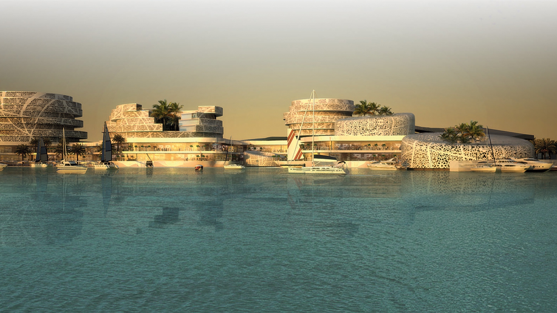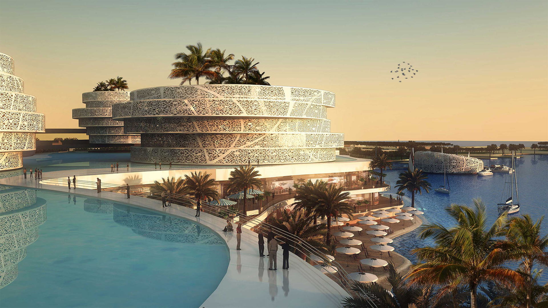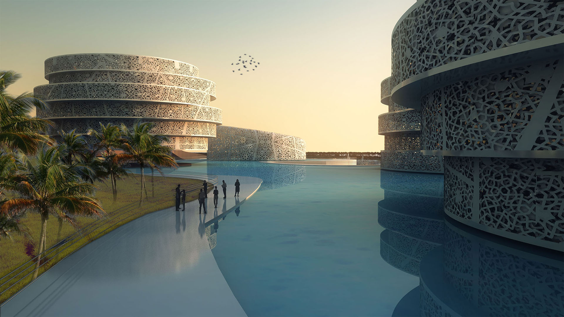 The project is located in the northern part of Jeddah City, which lies along the seashore not far from the major road linking the Red Sea coast to different towns. The uniqueness of the project area as well as the fascinating relationship between desert and sea – tightly linked to Saudi Arabia’s traditions and history – have inspired and guided the design project. The design links, (more specifically merges) the sea with the land, the rocks and the water, in a highly representative and strongly symbolic architectural complex able to provide its guests and visitors with a unique experience and the chance for a firsthand encounter with the riches of the Arabic culture and landscape. The design proposal is, for this reason, made up of two different parts: a base – closely recalling the horizontal development of the surrounding landscape – to house the common spaces, and the visitor areas: a series of “stones” or stone-shaped buildings that “float” either on artificial water surfaces (the pools) or on natural ones (the sea). The play of reflections of each building on the water multiplies its surfaces and brings out its geometries and shapes. The seven “stones” are made up of two to eight levels with a circular floor plan of different diameters and heights. Inside are green courts, “oases” filled with lush indigenous vegetation, that provide different sights and spatial conditions, depending on whether the rooms give onto the exterior or the interior of the building. Three of the “stones” are for the mostly house hotel rooms and suites, while the remaining ones serve for prominent functions such as a Convention Hall, Restaurants, Concert Hall. The upper floor of the higher “stone” houses a “food court” with several different restaurants that offer an undisturbed view of the surrounding landscape. The top floors are characterized by terraces and belvederi, which host recreational functions.