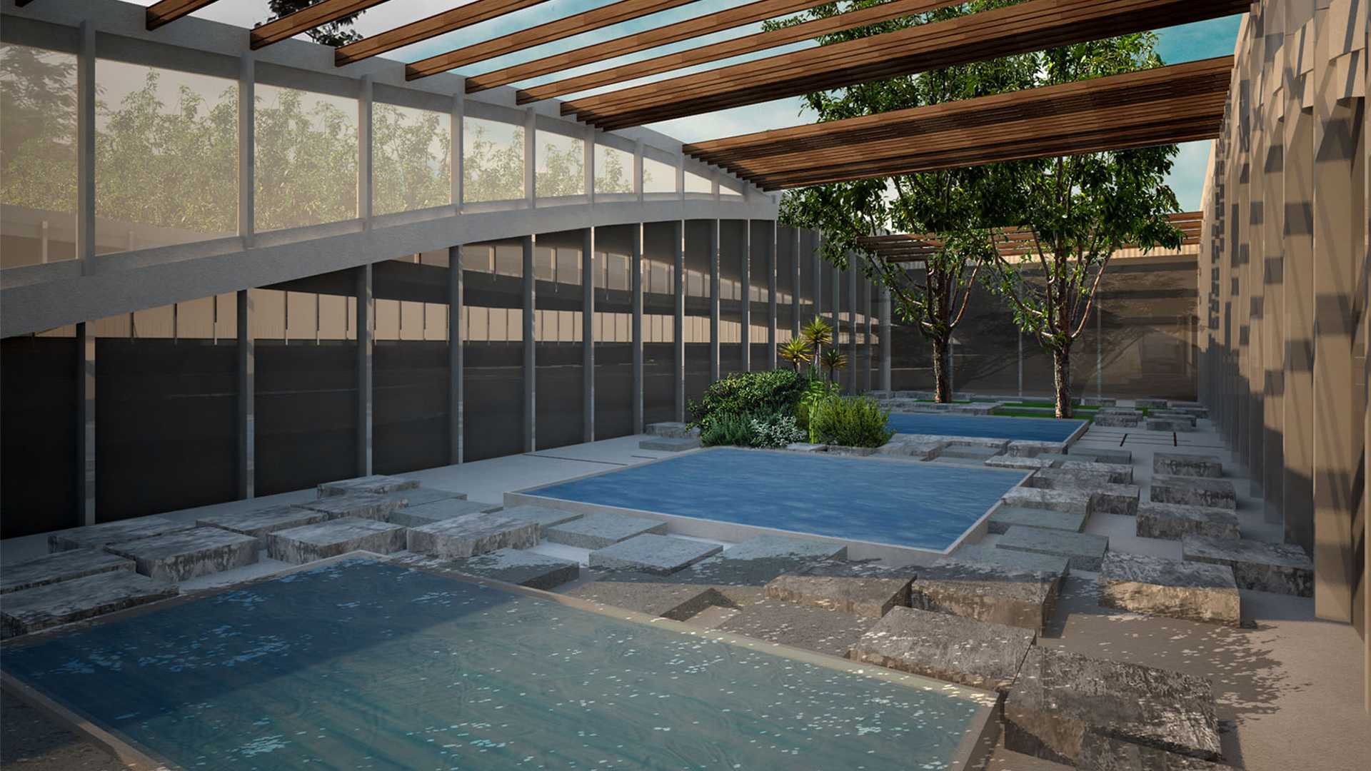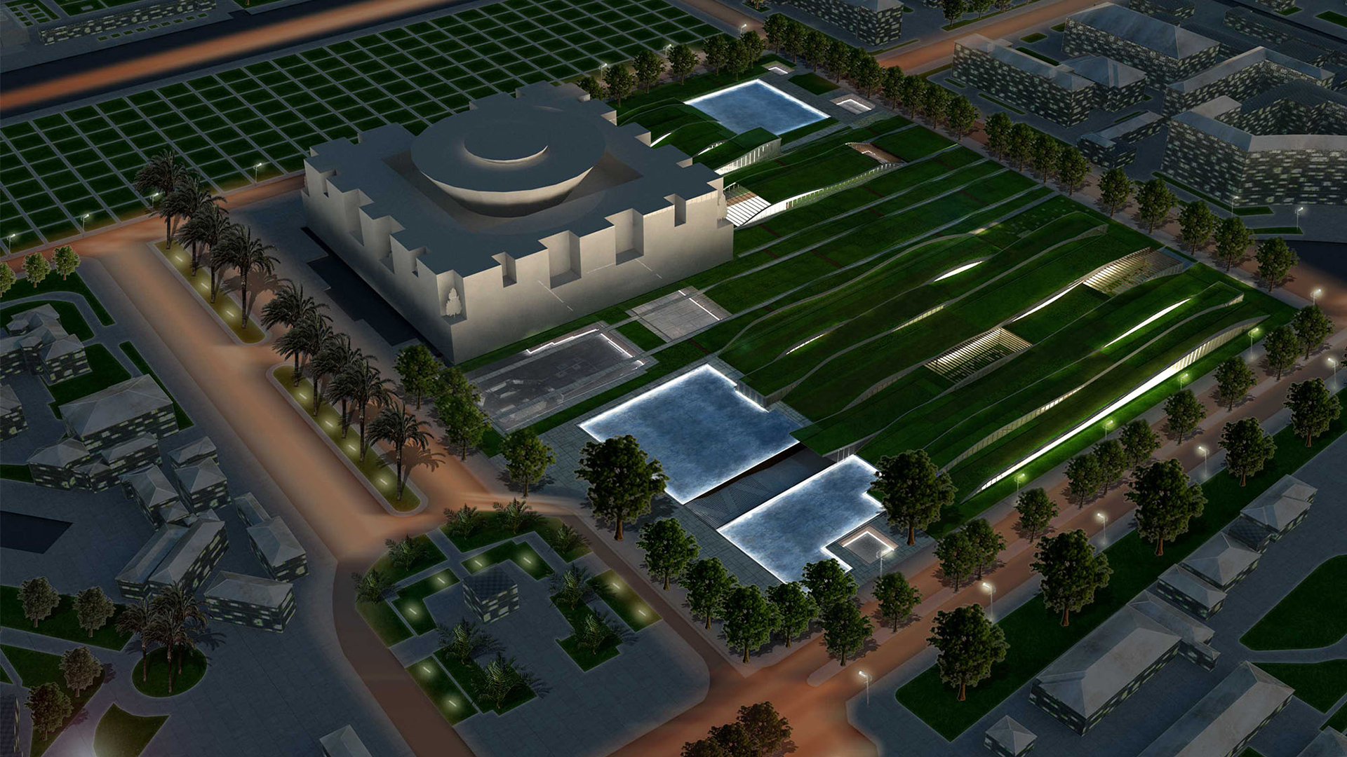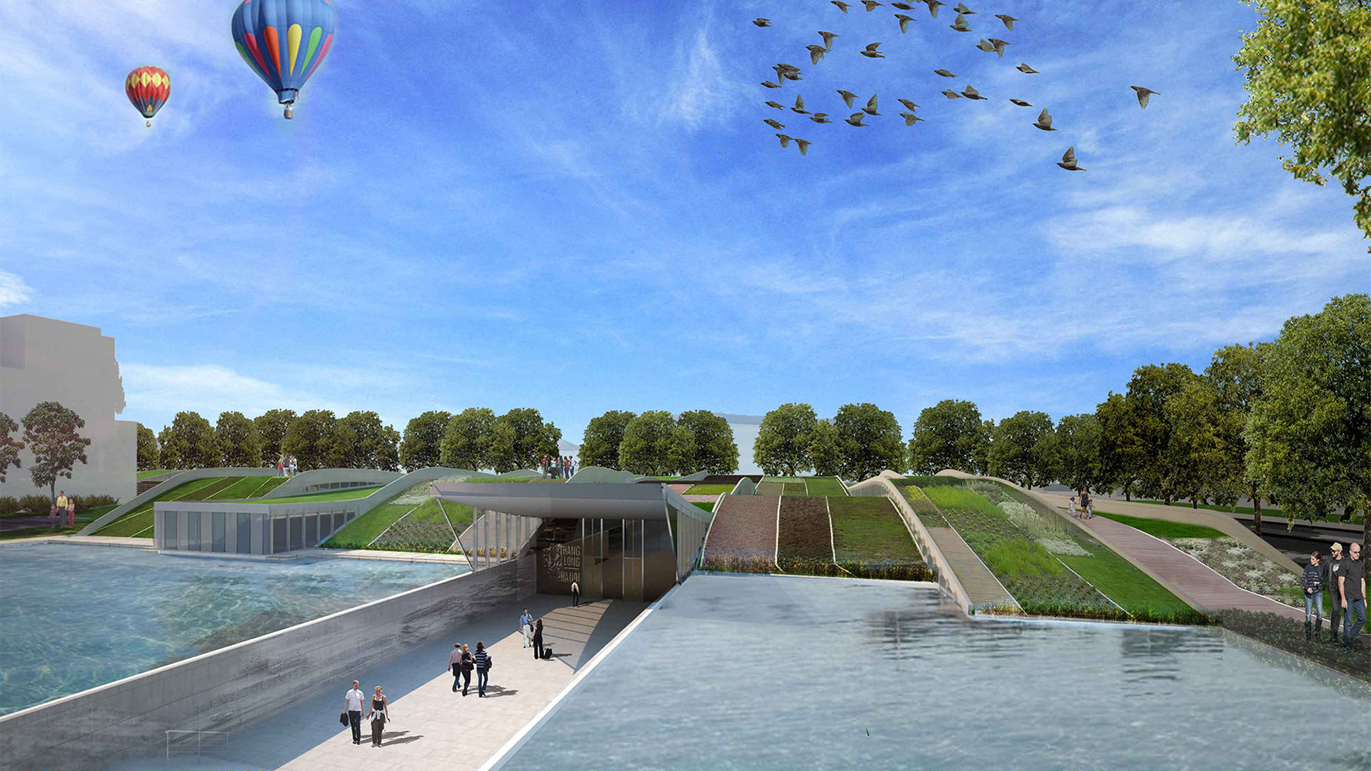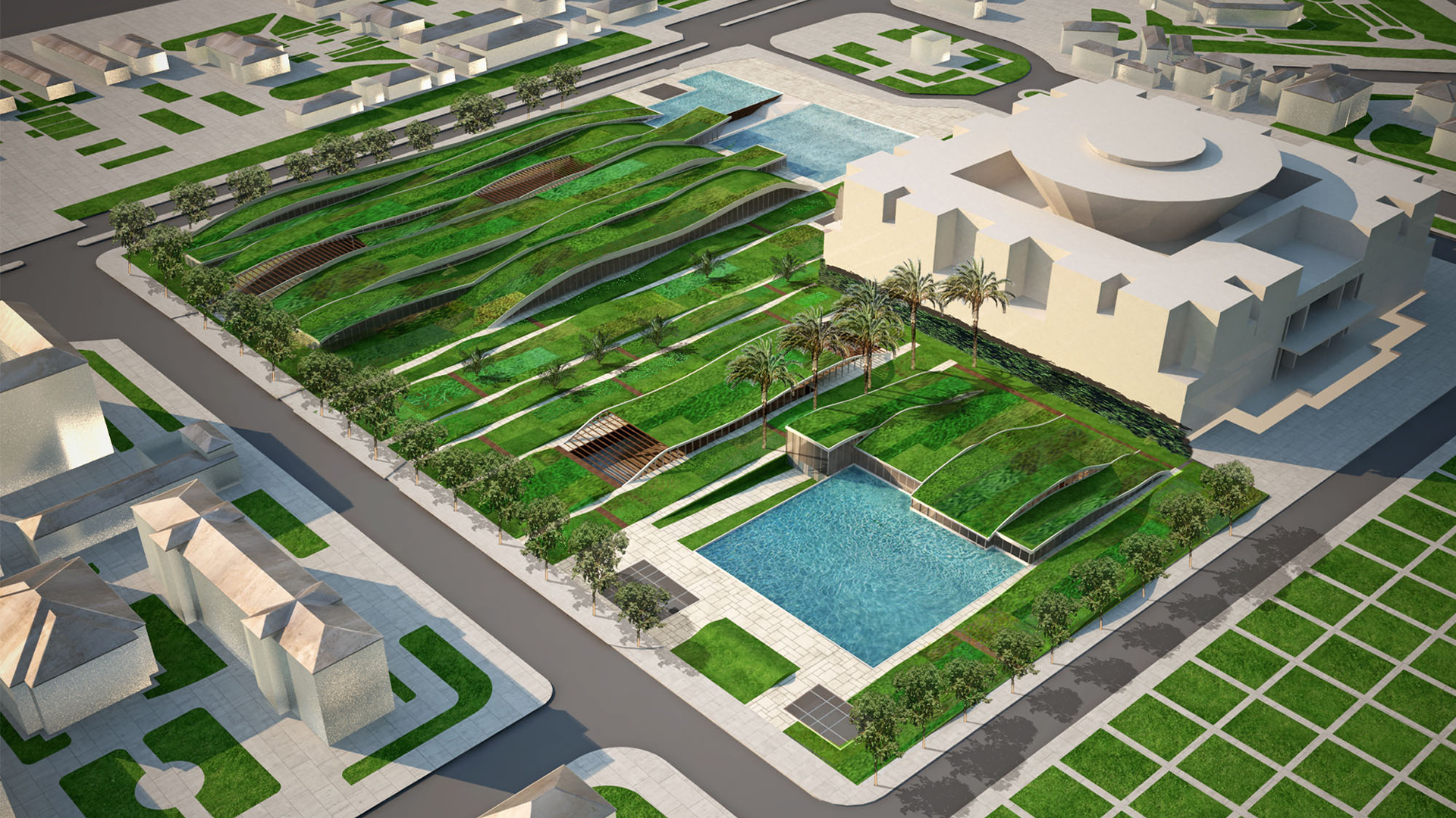 The project includes both archeological park and urban area without damaging to the environment. The museum is hiding under a green cover, green ribbons in a system of multi-layers and it protects the archeological ruins.