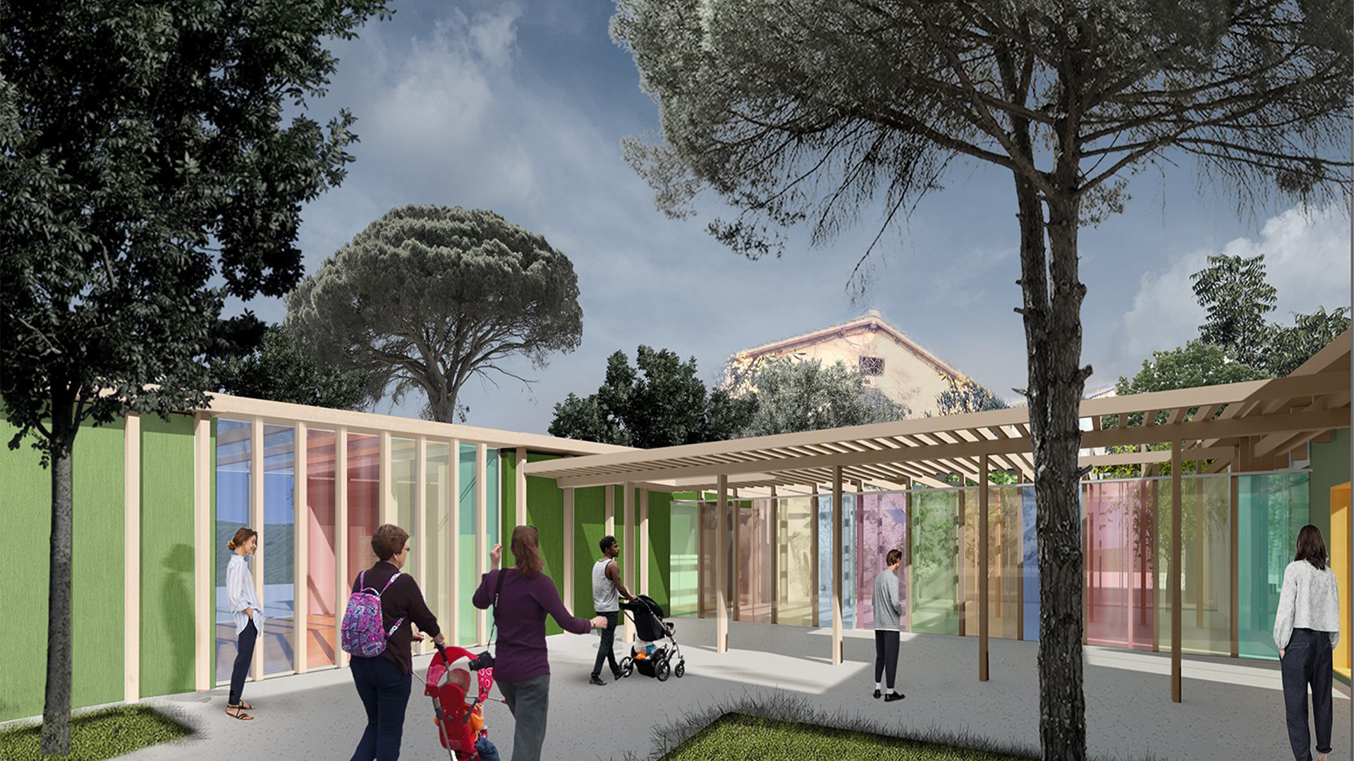 Different building bodies, therefore, alternate with open spaces that interact with each other. The succession of internal courtyards and “clearings” makes the school similar to an urban microcosm from which the student develops experiences of knowledge and sociality. In all buildings, the arrangement and size of openings take into account aspects related to sunlight, with a view to containing energy consumption but also to the visual experience. The new kindergarten is structured to allow the medium and large sections to use the spaces inside the central body with private access to the three courtyards for recreational activities, while for the small section, spaces within the two existing pavilions at the back are planned. The south facade, hosting the main entrance of the kindergarten, has been designed, in accordance with bioclimatic principles, as a large glass environment, defined as a winter garden, used as an atrium and a distribution space towards the classrooms.