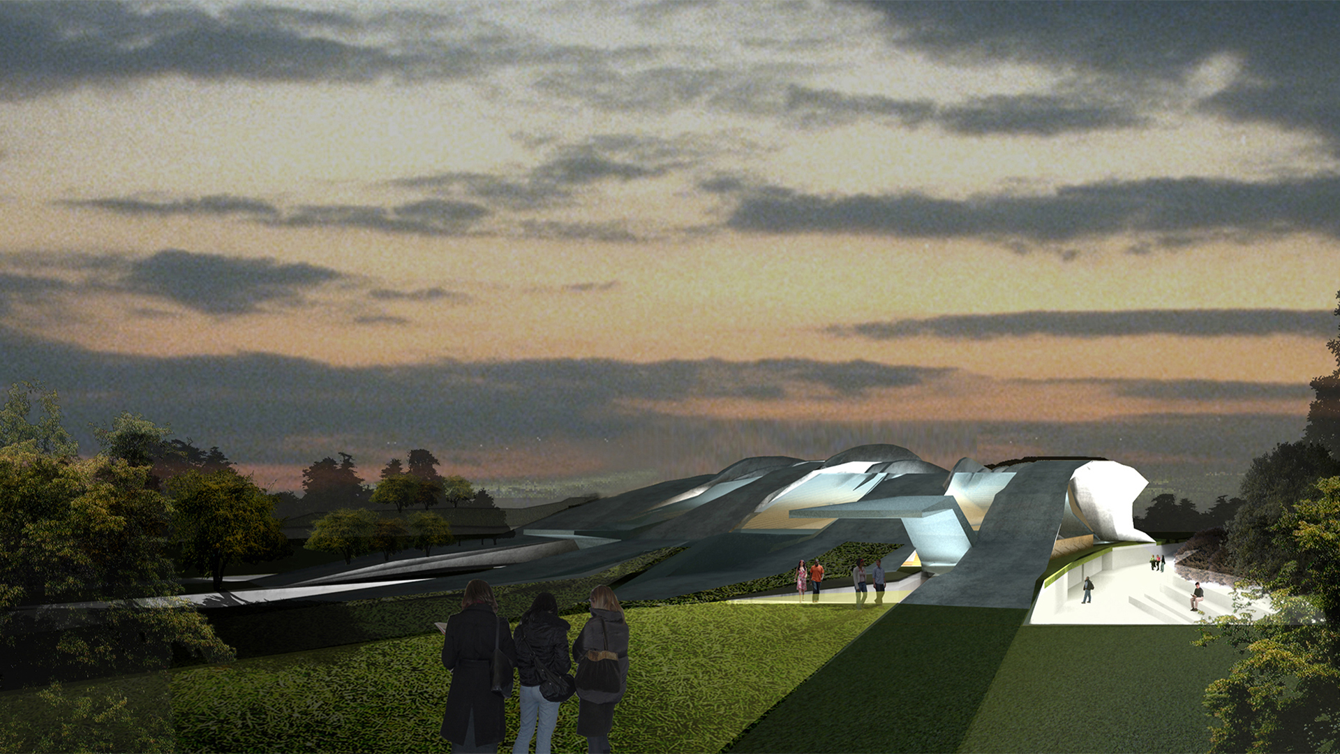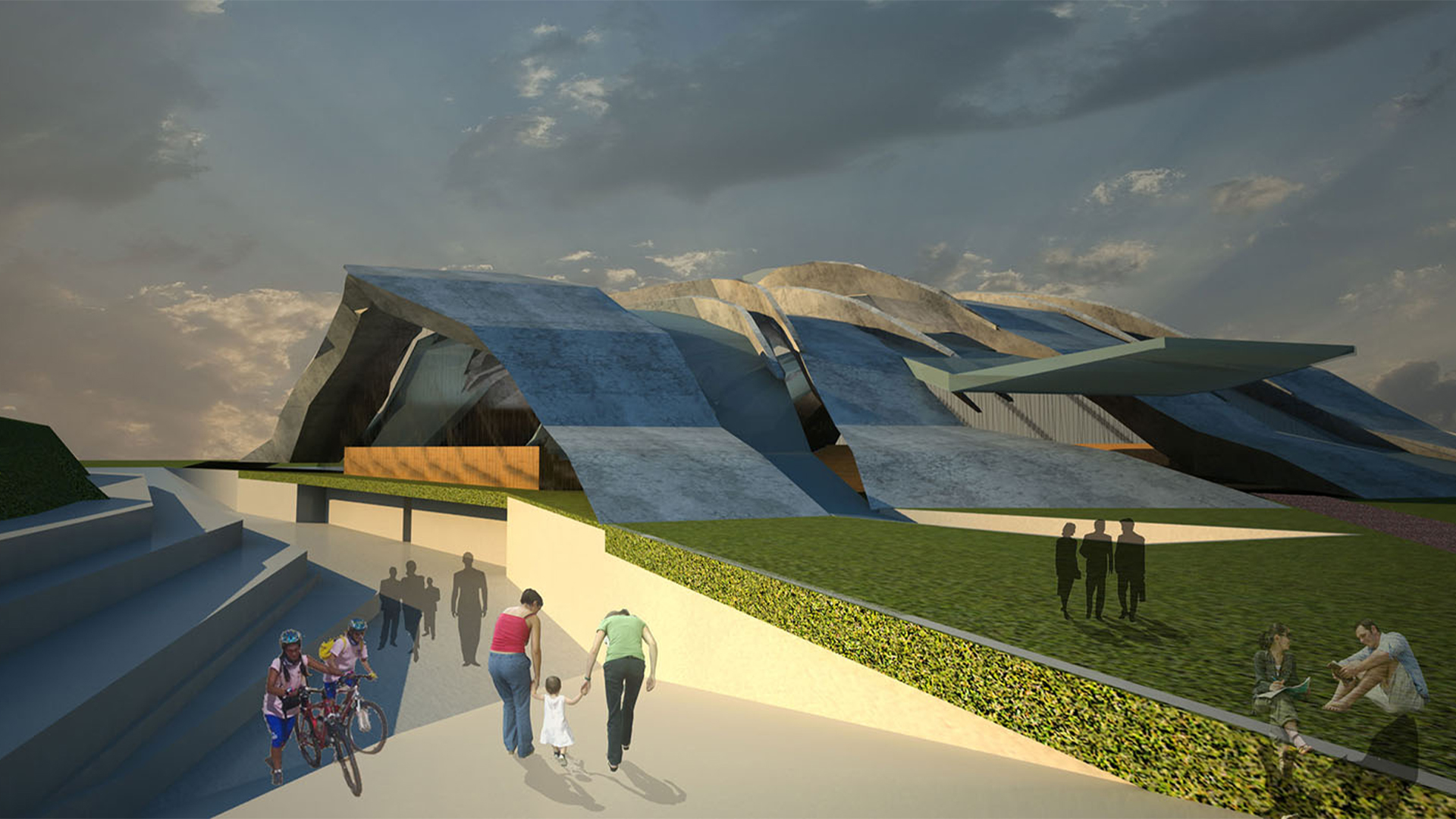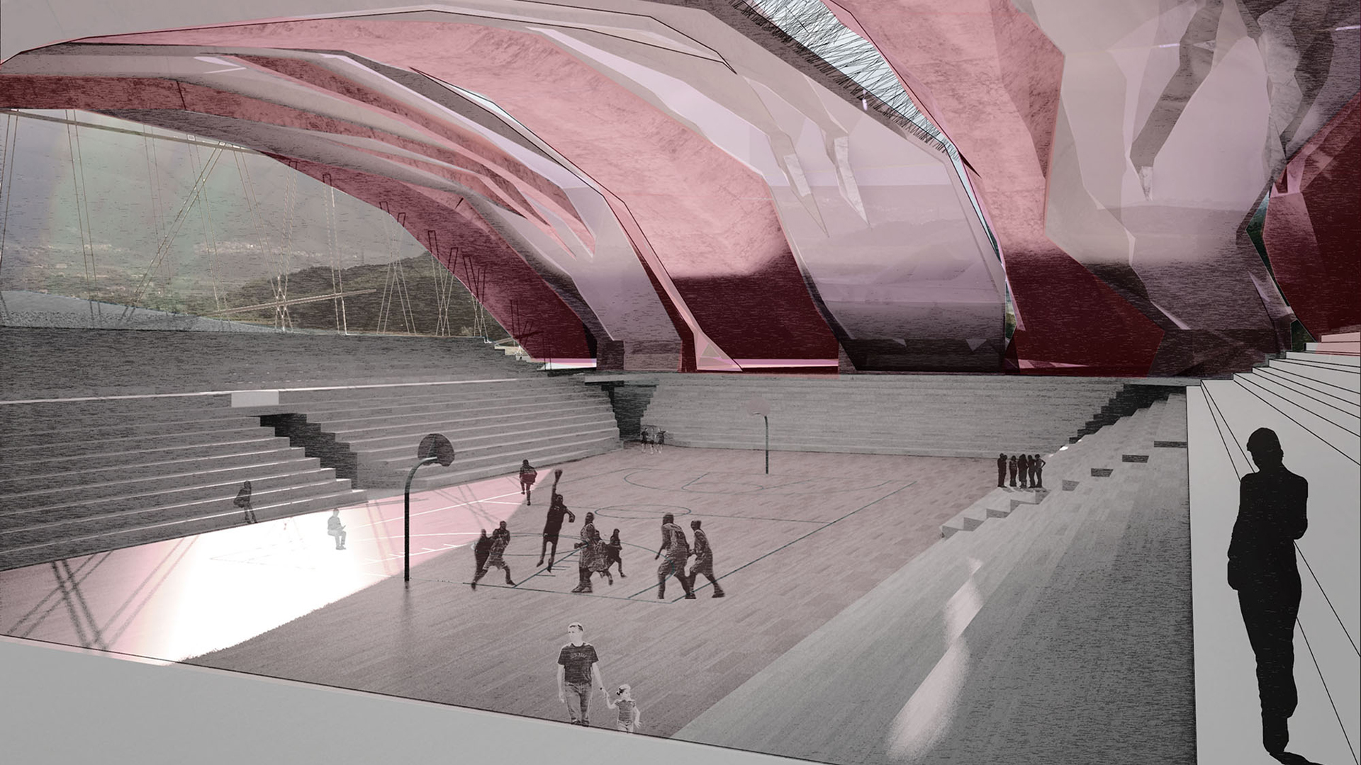 It explores the hybrid territory between the arena complex and the site, in an attempt to transcend the traditional figure-ground opposition, the passive site and the active building. The concept of neutral terrain gives way to the manipulated landscape strategy as structure and terrain become “interchangeable”.