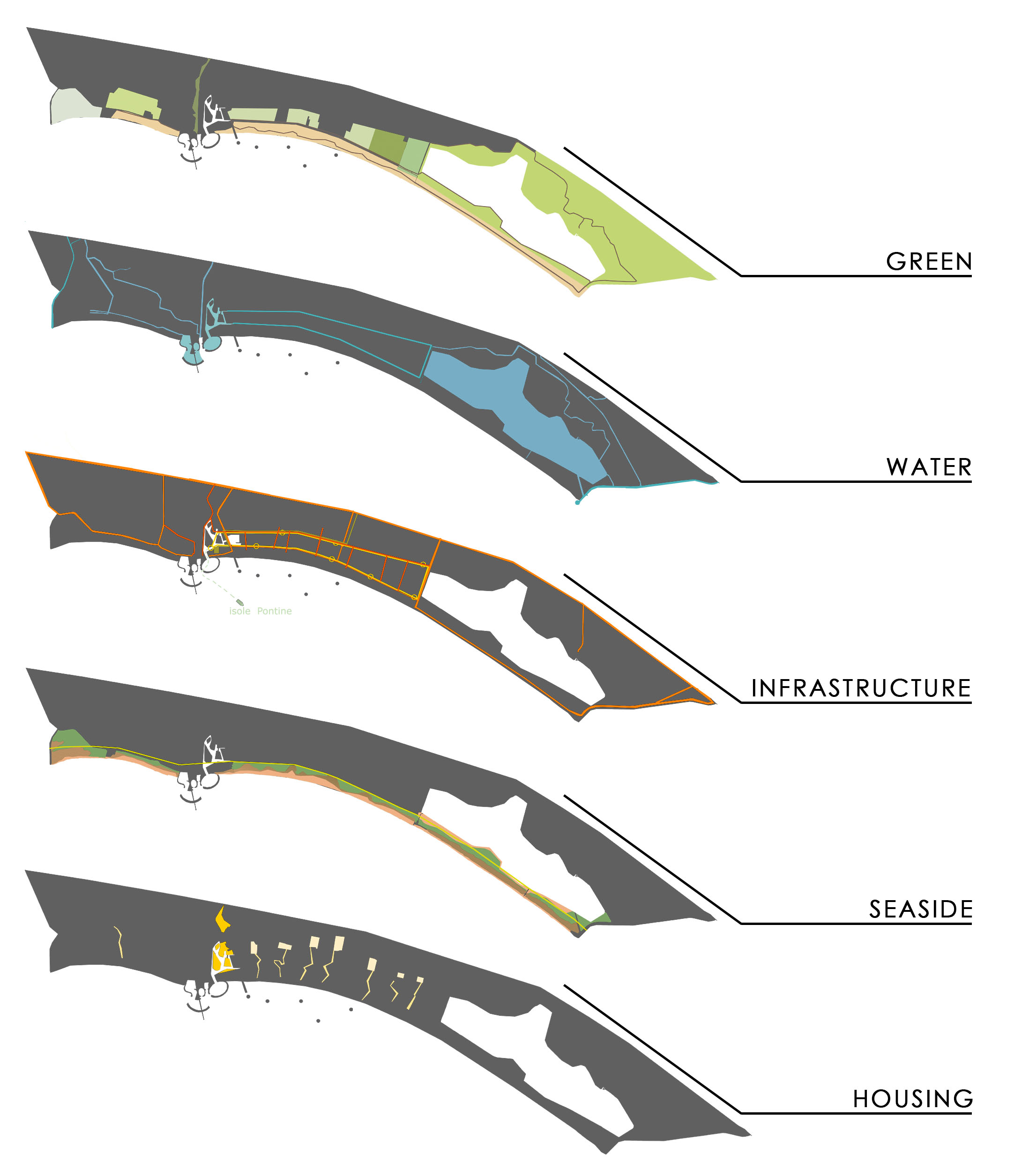 The intervention supposes a new urbanism arrangement for Latina’s coastline. The major items are: the peaceful coexistence between man and nature; the project of objects related to the human proportions; the proposal of formal, typological and systemic manufactures. The project improves itself on the follow methodological choices: preparation of defensive operas for the coastline; redevelopment of buildings, generally unauthorized, taking as reference model the benefit of the agro pontino’s drainage.