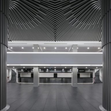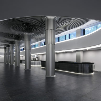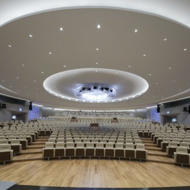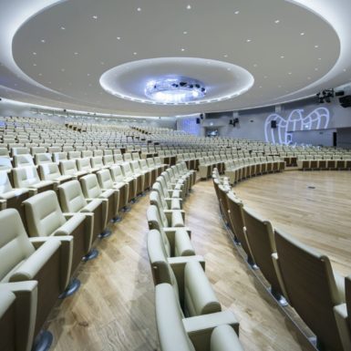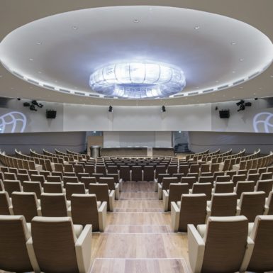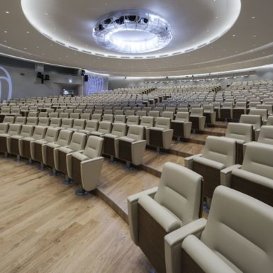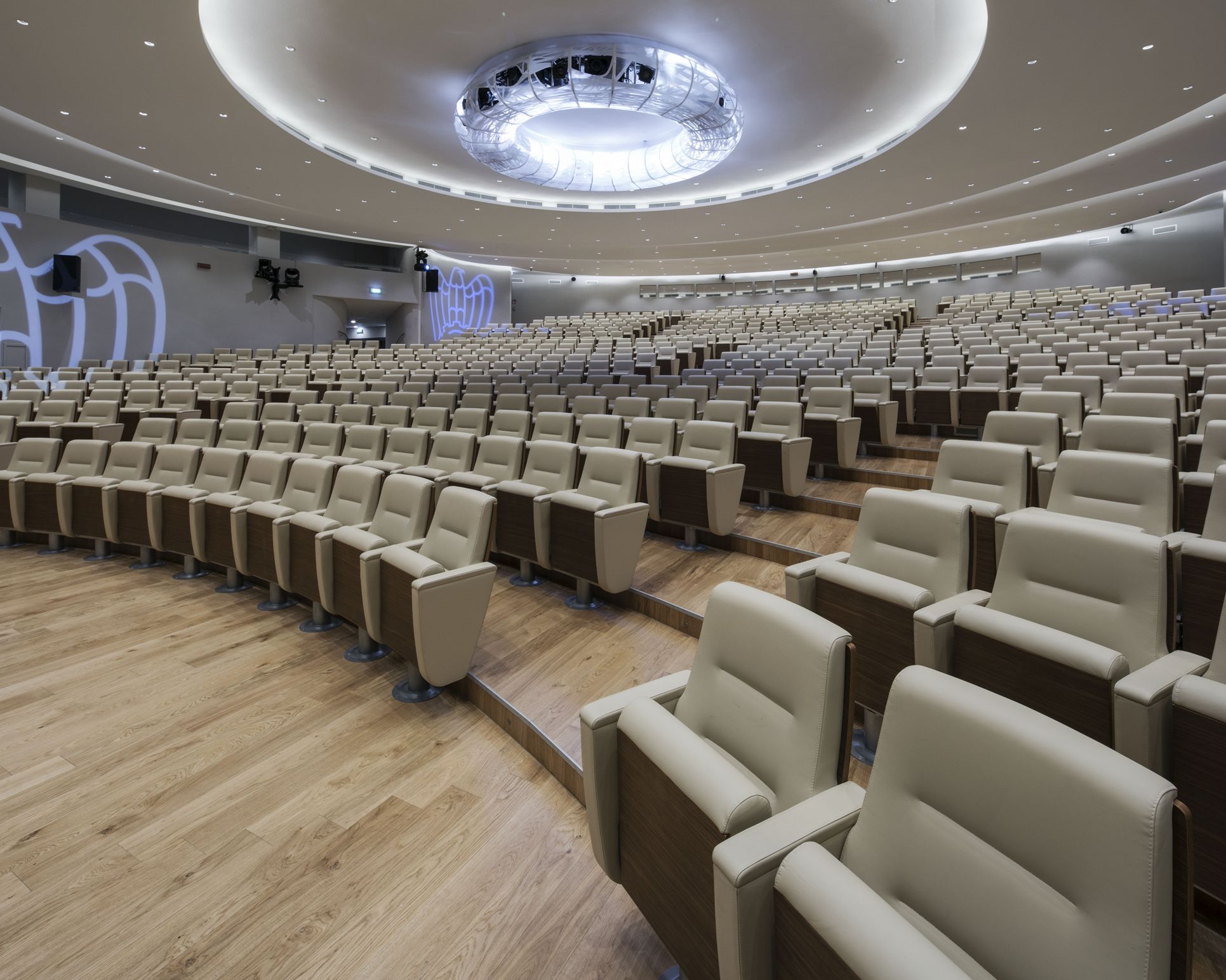 At the EUR in a plot adjacent to the Palazzo della Civiltà del Lavoro is the Confindustria building built in the late sixties by the architects Vincenzo and Edoardo Monaco. Inside this, there is the Auditorium della Tecnica, a Congress Centre with a large foyer and a conference hall of 800 seats. The interiors were designed by the architect Pierluigi Spadolini between 1971 and 1974 who created an interesting design project characterized by some expressive elements: a sequence of pillars that, with a structure like trees, hover in the double-height space of the foyer and a circular-shaped room whose spaciousness is accentuated by a radial false ceiling. The enhancement of the Auditorium della Tecnica wanted to give life to a valuable space, recently reinserted in the circuit of the Architecture of the modern city of Rome. The project provides a new energy to the complex preserving the value and the value of the existing structure, but modernizing the plant both on the technical side, through a regulatory adaptation that involves the use of innovative and quality materials, both the global image. Starting from the foyer, the double-height spatial character of the tree-like “structure” is reinterpreted using a new material: steel. The new material generates a variation of spatial perception, transforming a space, previously perceived as dark, into a bright and dynamic space. Innovative interior lighting and a new colour effect contribute to this perception. The stone paving is in total continuity with the external stone covering, to make this space seem a liveable urban interior. The room has undergone a profound transformation: all the existing steps have been replaced by other larger ones, the false ceiling is characterized by a new spatiality of slight concentric jumps that enhance the space of the room, at the center of which has been reinterpreted, in a contemporary key, a large circular lamp. The room is also equipped with a high acoustic efficiency and a very advanced technology: a professional amplification system, multiple screens and an advanced and ductile lighting system.